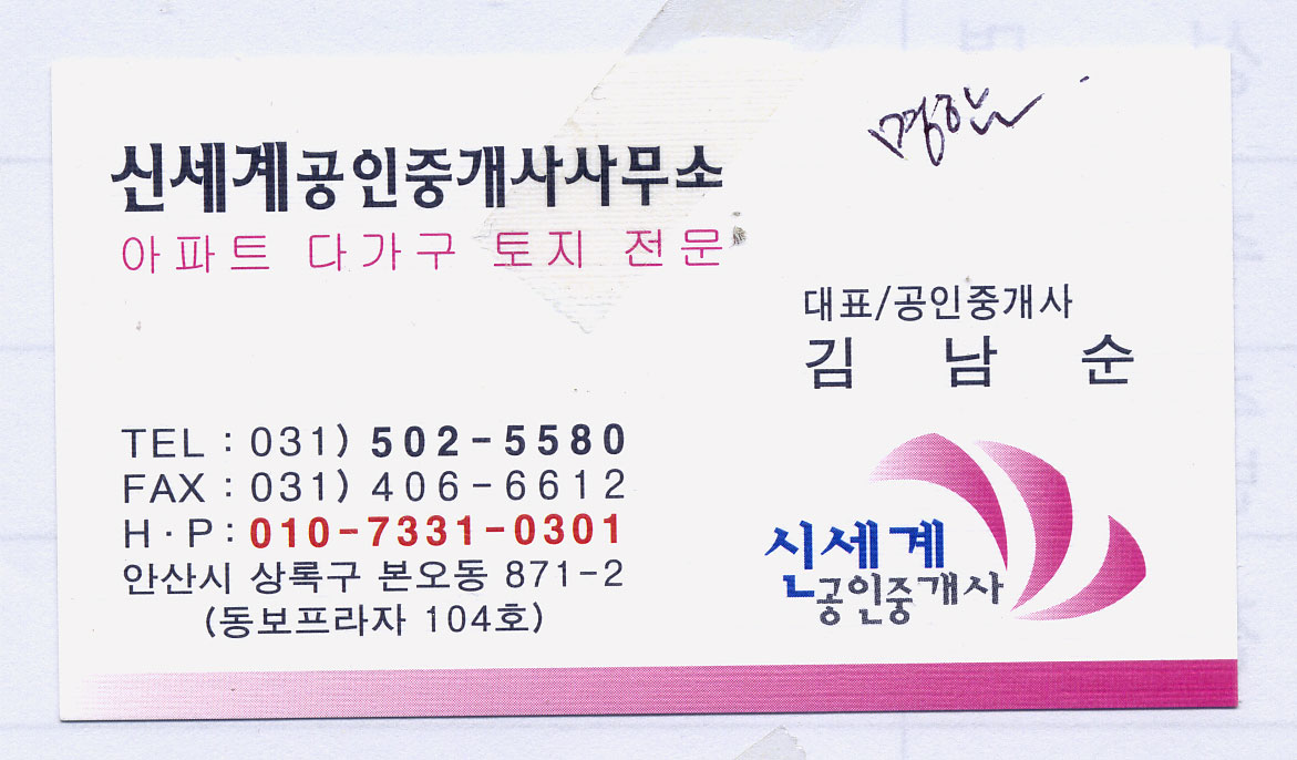 급히 글씨 부탁드립니다~ 조희진 일반 0 3882 2009.05.16 11:43 오늘 들어가야 하는 건데 글씨체가 없어서요~ 똑같이 해달라고 하셨는데~ 상호명하고 하단 상호명 부탁드립니다. 신세계공인중개사사무소 신세계공인중개사